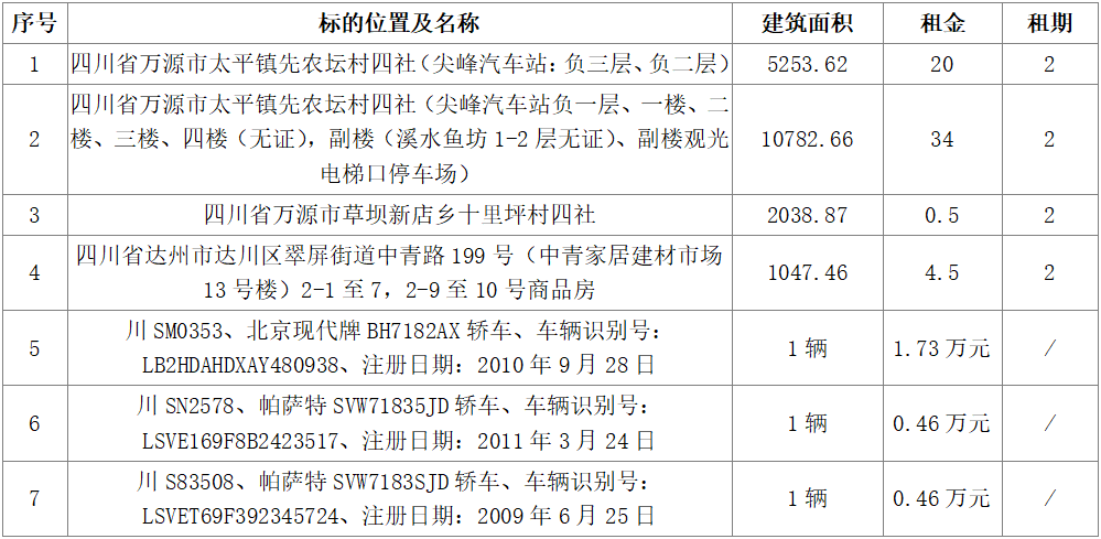 上述1至4号标的(不含装饰装潢)为租赁权拍卖,5-7标的为所有权拍卖(不含车辆号牌)即日起展示于所在地。有意竞买(租)者请自行审鉴并查阅相关资料,拍卖人与资产出租方均不承担标的物任何瑕疵担保责任。原承租人参与竞租报名享有同等租金价的优先竞买(租)权,否则视为放弃优先竞买(租)权。租赁报名时持有效身份证件及参考价10%竞买(租)保证金(不计息)办理竞租手续,保证金缴纳时间2025年10月9日16时止(以到账时间为准)。