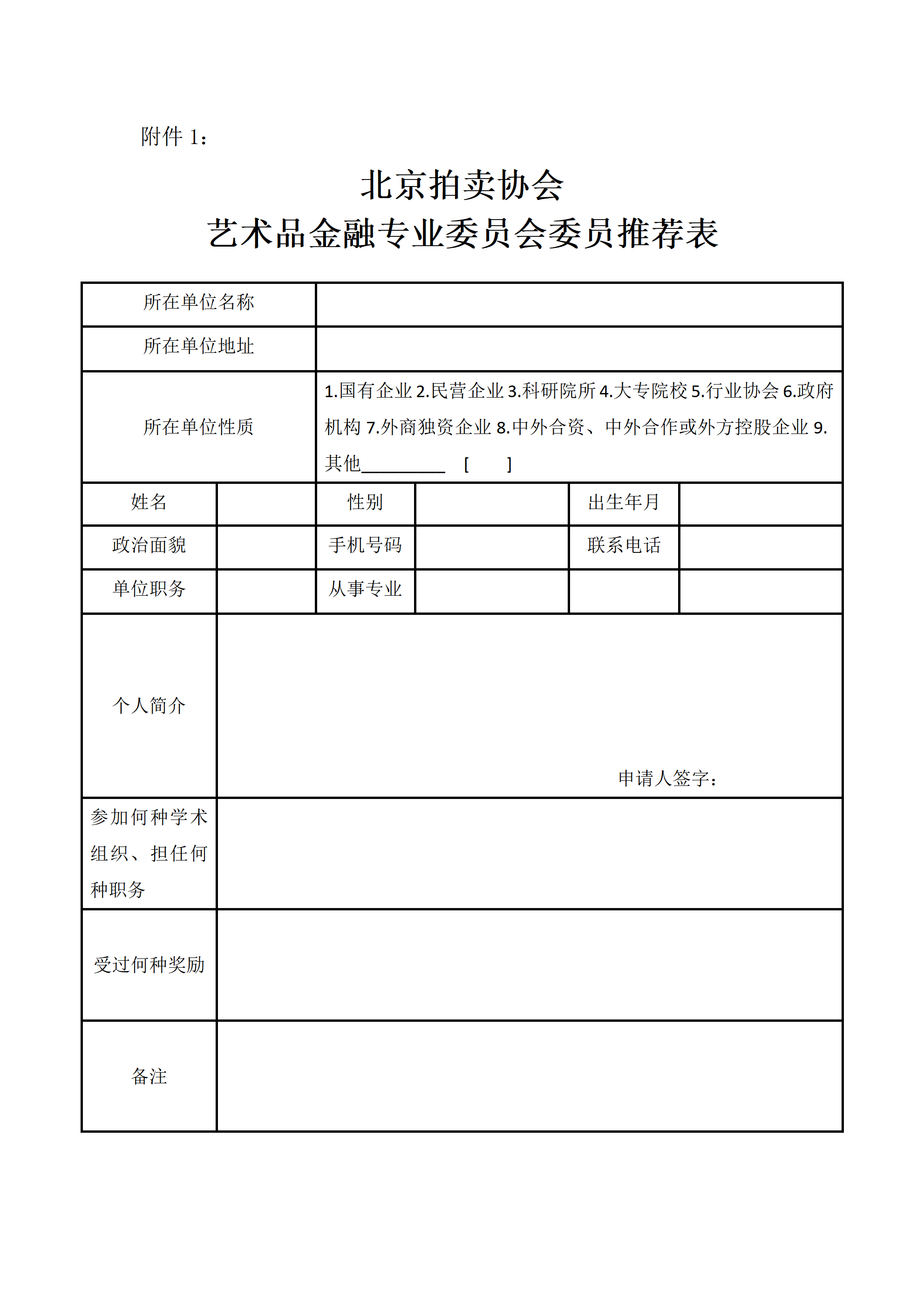 北京拍卖协会艺术品金融专业委员会委员推荐表