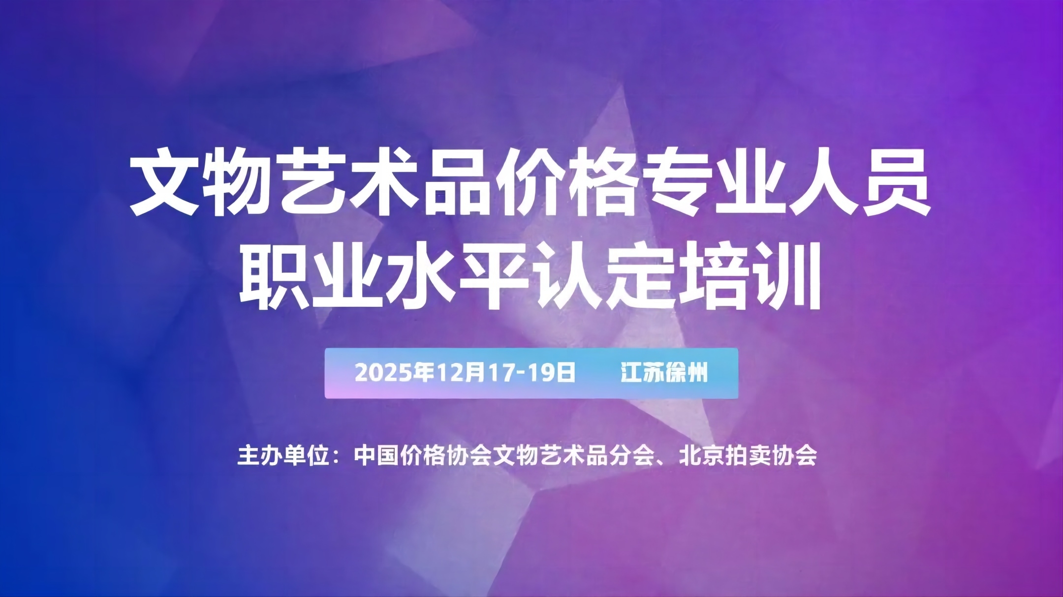 由北京拍卖协会与中国价格协会文物艺术品分会联合举办的文物艺术品价格专业人员职业水平认定培训、认证工作,将于2025 年 12 月 17-19 日在江苏徐州开展。完成培训并通过考试、考核者,将获得“文物艺术品价格专业人员证书”。