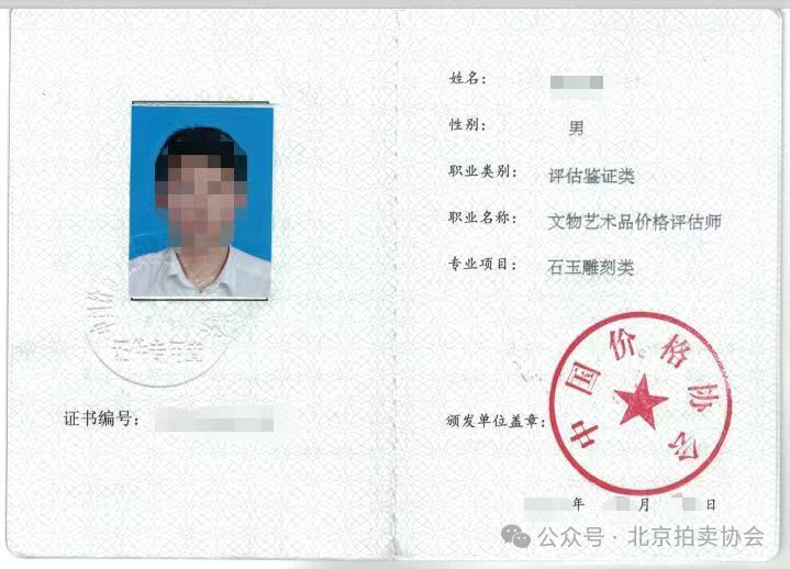 “文物艺术品价格员” “文物艺术品价格评估员”证书式样: