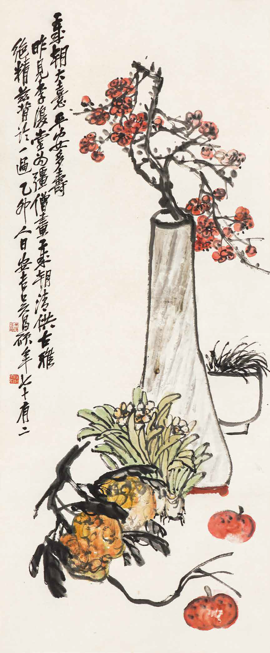 【款识】岁朝大喜,平安多寿。昨见李复堂为强僧画岁朝清供,古雅绝精,兹背临一遍。乙卯人日,安吉吴昌