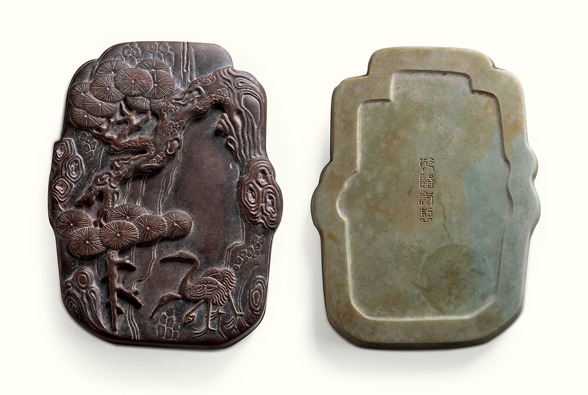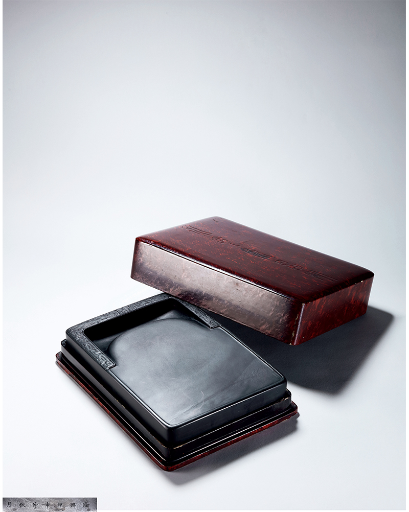 提要:此砚取龙尾歙石裁成,发色均匀,漆黑如凝墨,抚之细腻柔滑,触之生温,属歙砚之上品。整砚裁作圆角方形,开浅平砚堂,砚首圆滑下凹成深峻墨池,边沿雕刻夔龙纹,其纹饰仿自战国青铜铸纹,浮于漆黑砚石之上,更显古意盎然。此砚之正面雕刻线条极为简洁,除砚首仿古夔纹外无一纹饰,惟见砚堂数道浅刷丝纹。砚背则随砚身刻浅池,泛自然石理,若秋水荡波。其上以细线浅刻鸟篆,为“永命寿昌”四字,所刻线条纤细如发,流畅自然,足见刻者刀法之纯熟。其下刻一篆文方印“乐寿老人”,落“隆兴甲申仲秋月”款。