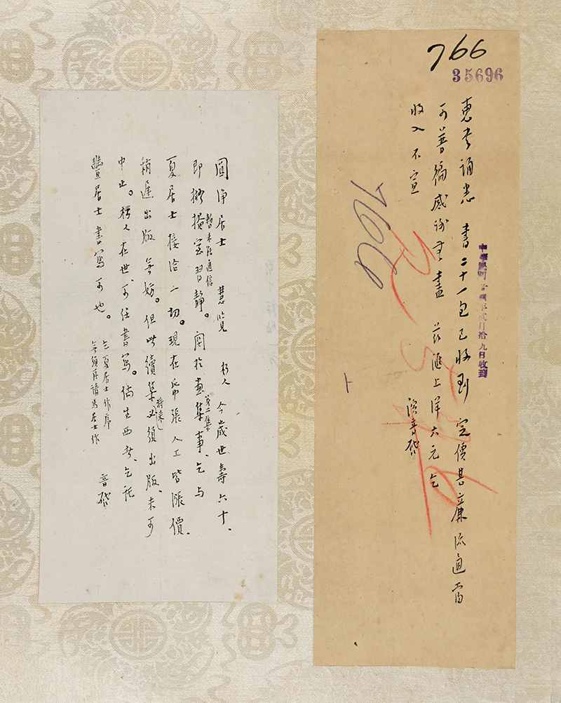 提要:佛學書局總經理沈彬翰上款。 此為弘一法師論出版名篇《人生之最後》以及將手稿贈予廣洽法師的信札,談到該書“排板、大小及圈點、行數、格式”均參照弘一編訂的又一代表作《寒笳集》(又名《蕅益大師警訓略錄》,1933年佛學書局出版)。 在初校之後,佛學書局將此稿件寄回弘一法師,由他贈給廣洽法師,後又由廣洽在新加坡龍山寺寄贈予香港法界學苑妙因律師,輾轉由臺灣界中法師收藏,再經佛陀教育基金會刊印單行本廣布。信件又及匯款五十洋元以充該書付印費,為封面題字和郵寄《法華經》寫本種種;所及大鍾,指募建九華幽冥鍾。弘一為勸募員之一。相關募捐報告曾在《佛學半月刊》連載十餘次。 信箋上有佛學書局鋼印“中華民國廿參年十二月五日收到”,及收件編號31789。這與本專場第3026號完全相同,故二信均作於1934年12月初。但根據第3026號中“此書草稿,已交郵局掛號寄與沈彬翰居士”一言,可知其寫作時間略早於本信。同時,弘一在是信以及第3026號中,再三強調銀行所匯五十洋元,係《人生之最後》付印費連同包紮費、郵費、掛號費,出版後足以得到樣書若干。另外,查《李叔同·弘一大師年譜長編》,信首弘一法師所提到的“前奉一函,及法華寫經本”,指他為沈彬翰母親莊閒所書《法華經》作序。年譜1934年12月有載“應上海佛學書局沈彬翰之請,為沈母莊閒女居士所書《法華經》作《莊閒女居士手書<法華經>序》,署‘後二十三年歲次甲戌晉江尊勝院沙門月幢,時年五十有五’”。 《人生之最後》是弘一最為重要的佛學哲思著作之一,主要是對佛教中生命現象的反思以及對來世信仰的論證。他藉以緒言、病重時、臨終時、命終後一日、薦亡等事、勸請發起臨終助念會、結誥共七章實際的行動來討論生與死的人生大命題,進而闡述佛學中生命的終極價值問題。《人》文起源于弘一法師于 1932 年 12 月受邀參加廈門妙釋寺念佛會的講演稿,1934 年 10 月親自刪改重治,後分97、98、99三期刊載於《佛學半月刊》。為了紀念與了識律師友誼,而在1935 年 1 月出版發行單行本,正是書寫此信後不久。