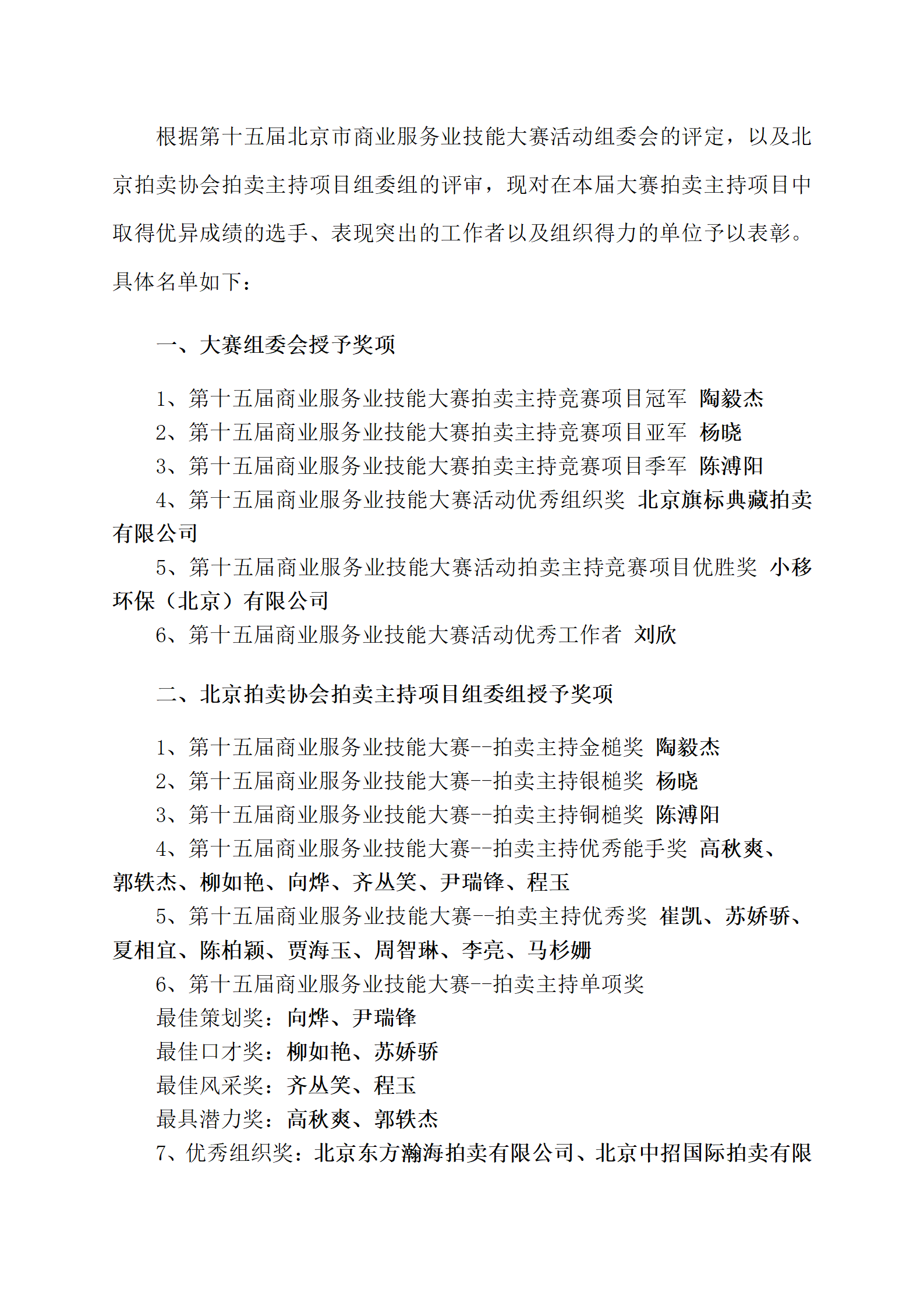 关于表彰第十五届北京市商业服务业技能大赛——拍卖主持项目获奖选手及单位的决定
