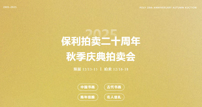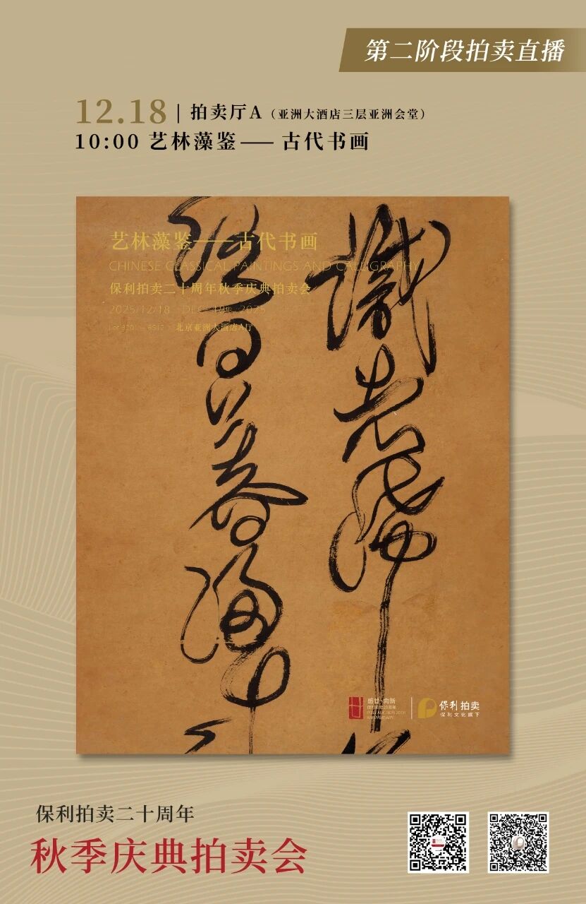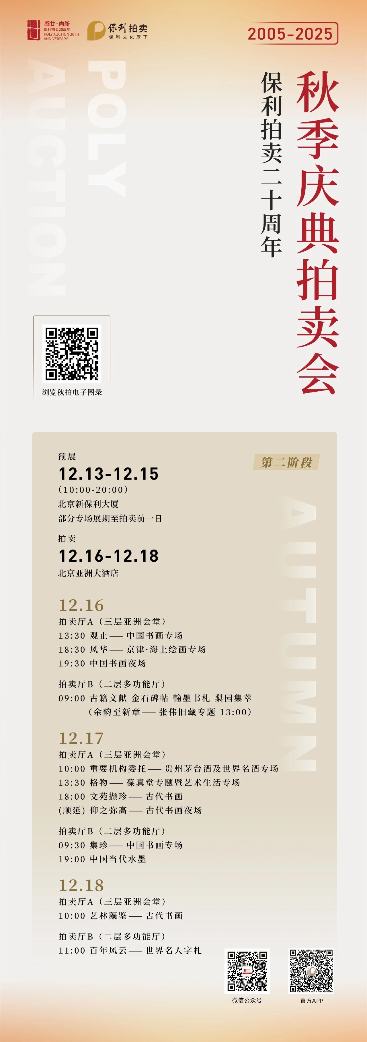 12月13日至15日,保利拍卖二十周年秋季庆典拍卖会第二阶段预展于北京新保利大厦隆重登场,中国书画、古代书画(含古籍文献)、陈年佳酿、世界名人字札,4大门类,逾千件艺术珍品,汇聚一堂,共同呈现一场融汇古今的艺术盛宴。诚邀各位藏家朋友莅临观展,期待与您共赴这场艺术之约,于珍品之间,觅得心动之选。