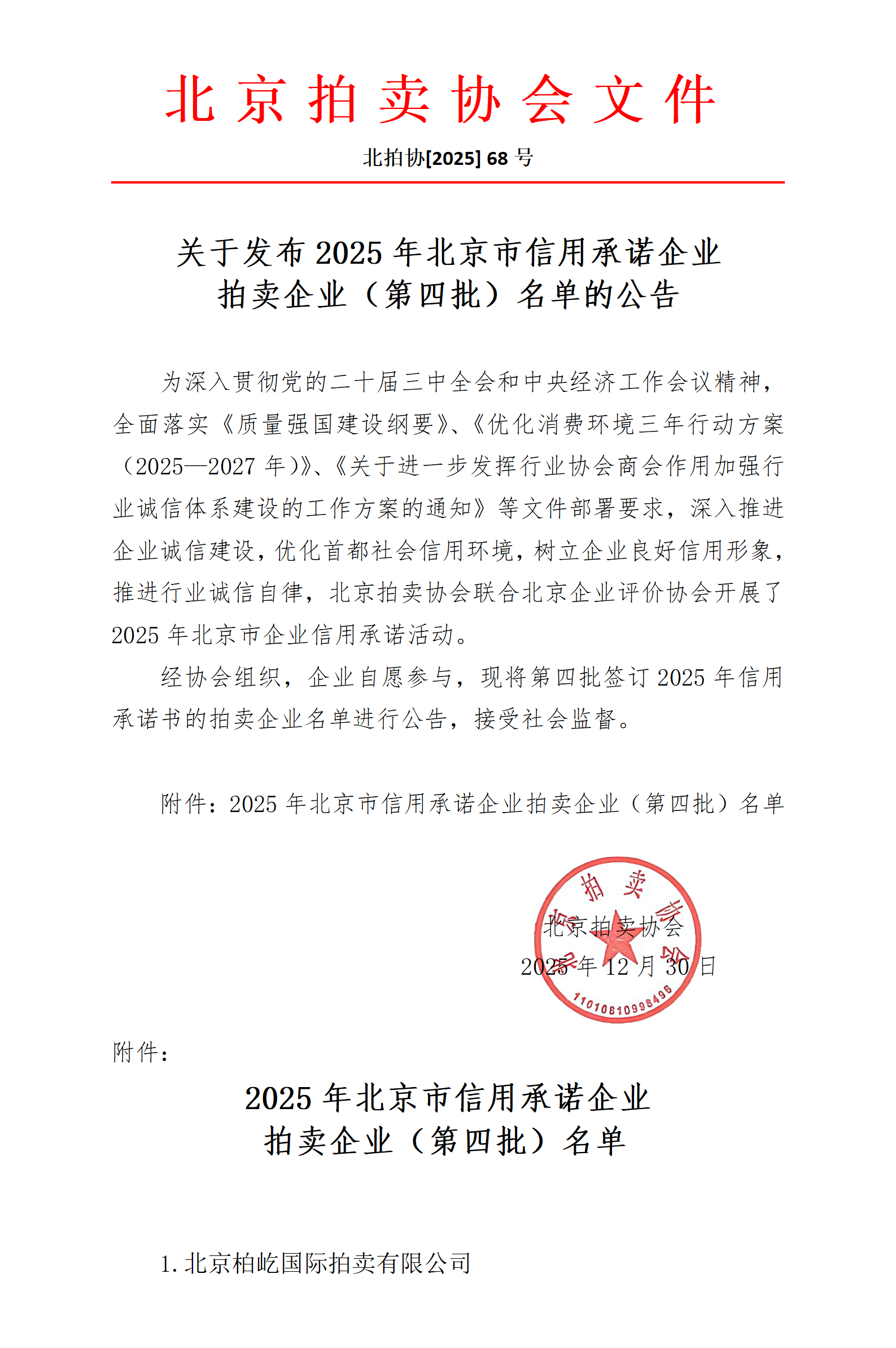 关于发布2025年北京市信用承诺企业拍卖企业(第四批)名单的公告