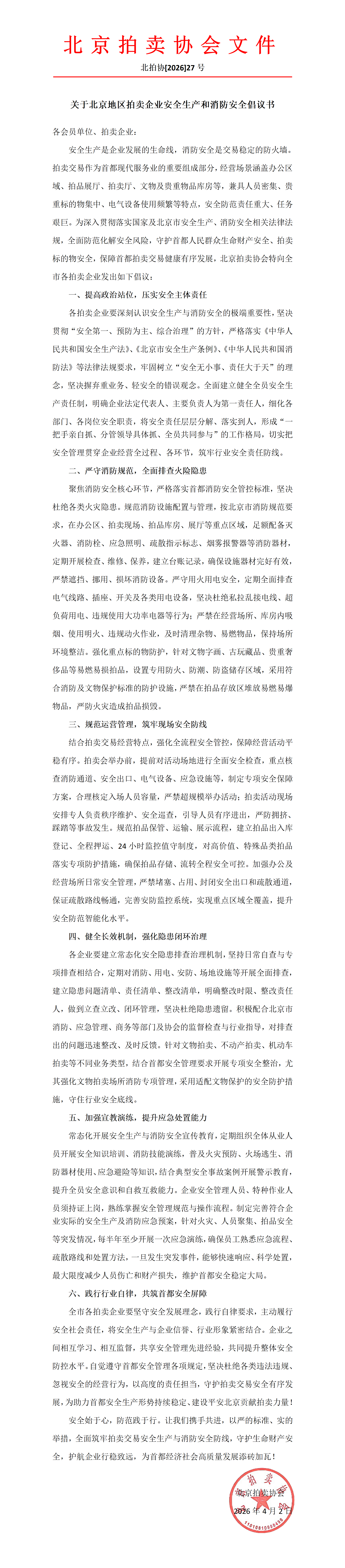 关于北京地区拍卖企业安全生产和消防安全倡议书