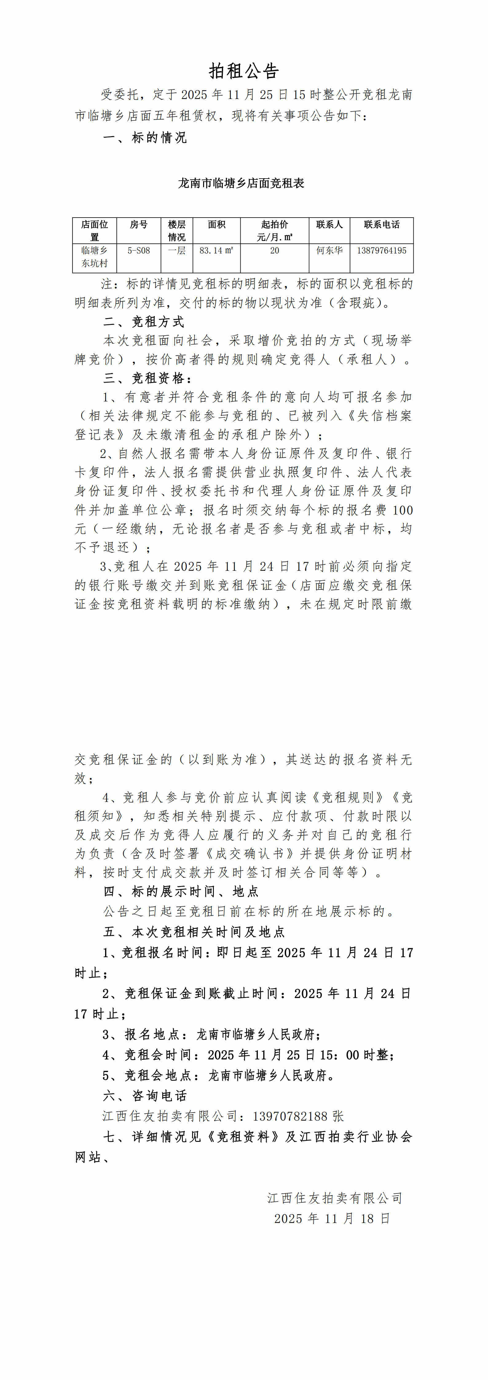 公告方承诺:本公告所载信息的真实性、准确性、完整性、合法性及有效性,由江西住友拍卖有限公司承担。中国发展网及运营方不承担责任。 责任编辑:时海丹 原文链接:http://finance.chinadevelopment.com.cn/gsgg/2025/11/1969631.shtml
