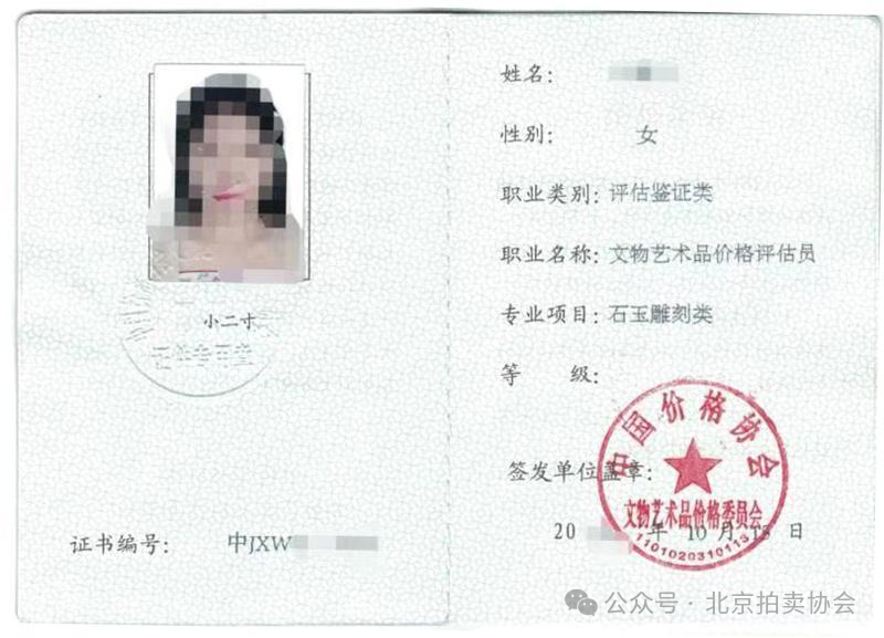 “文物艺术品价格员” “文物艺术品价格评估员”证书式样:
