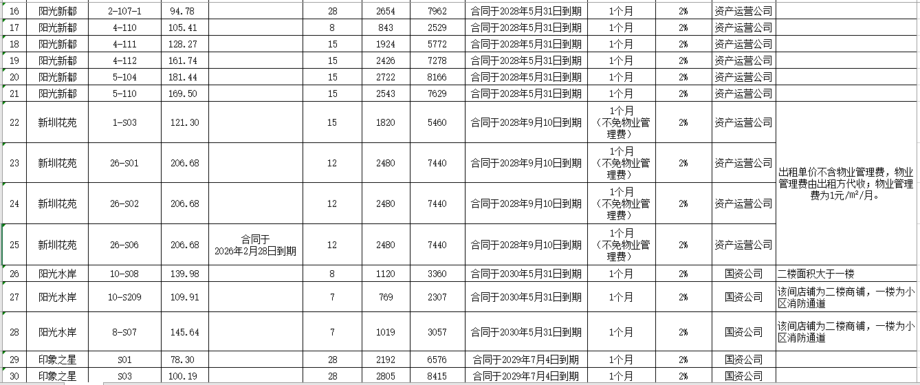 注:标的详情见竟拍标的明细表,标的面积以竞拍标的明细表所列为准,交付的标的物以现状为准(含瑕疵);新圳花苑商铺起拍单价不含物业管理费,物业管理费由出租方代收,承租人按1元/m²/月的标准缴纳物业管理费。其余商铺物业管理费由承租人自行按物业公司收费标准直接向物业公司缴交。