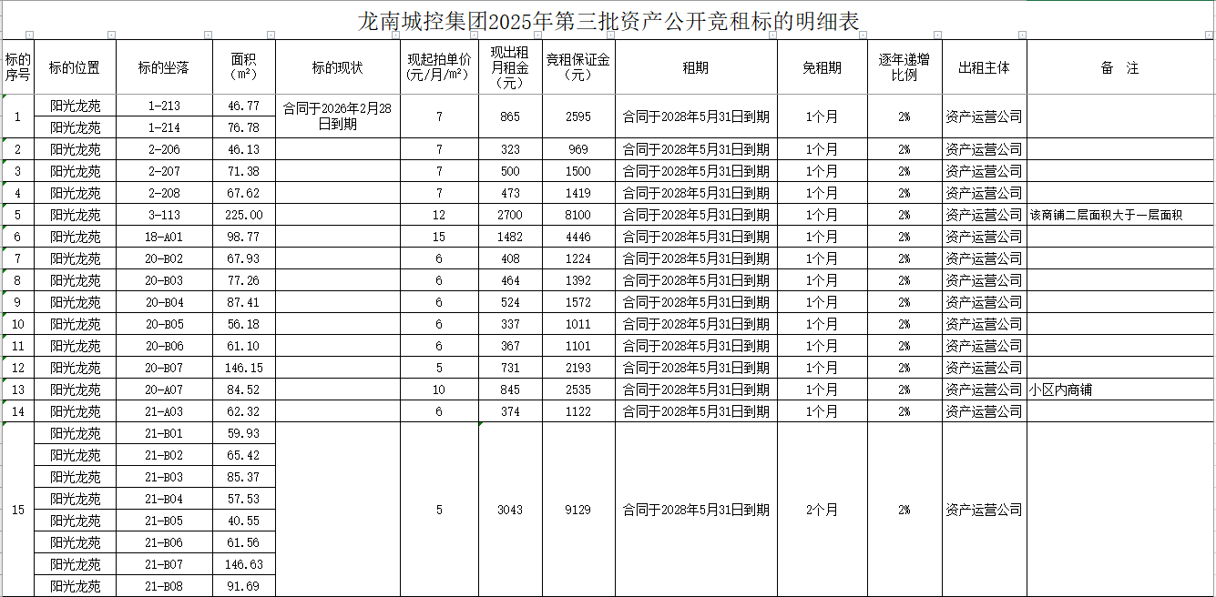 阳光龙苑、阳光新都、新圳花苑、金塘花苑、宜居花园、阳光水岸、印象之星、印象锦院、印象江畔、翼龙围安置区、龙洲安置区、林业车队等区域共计 311宗商铺经营性资产商铺租赁权(根据报名情况可现场调整标的竞拍顺序)。