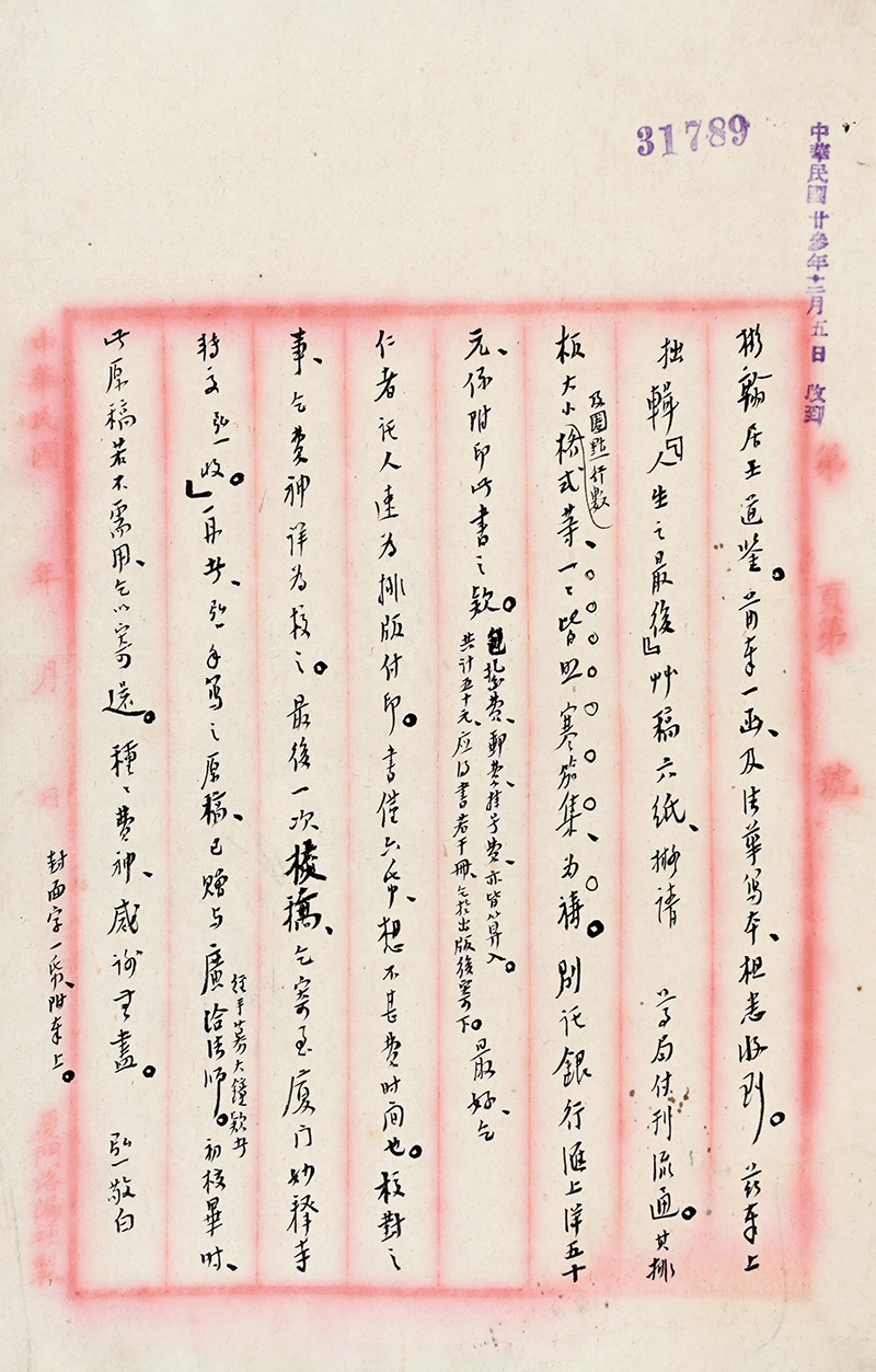 提要:佛學書局總經理沈彬翰上款。 此為弘一法師論出版名篇《人生之最後》以及將手稿贈予廣洽法師的信札,談到該書“排板、大小及圈點、行數、格式”均參照弘一編訂的又一代表作《寒笳集》(又名《蕅益大師警訓略錄》,1933年佛學書局出版)。 在初校之後,佛學書局將此稿件寄回弘一法師,由他贈給廣洽法師,後又由廣洽在新加坡龍山寺寄贈予香港法界學苑妙因律師,輾轉由臺灣界中法師收藏,再經佛陀教育基金會刊印單行本廣布。信件又及匯款五十洋元以充該書付印費,為封面題字和郵寄《法華經》寫本種種;所及大鍾,指募建九華幽冥鍾。弘一為勸募員之一。相關募捐報告曾在《佛學半月刊》連載十餘次。 信箋上有佛學書局鋼印“中華民國廿參年十二月五日收到”,及收件編號31789。這與本專場第3026號完全相同,故二信均作於1934年12月初。但根據第3026號中“此書草稿,已交郵局掛號寄與沈彬翰居士”一言,可知其寫作時間略早於本信。同時,弘一在是信以及第3026號中,再三強調銀行所匯五十洋元,係《人生之最後》付印費連同包紮費、郵費、掛號費,出版後足以得到樣書若干。另外,查《李叔同·弘一大師年譜長編》,信首弘一法師所提到的“前奉一函,及法華寫經本”,指他為沈彬翰母親莊閒所書《法華經》作序。年譜1934年12月有載“應上海佛學書局沈彬翰之請,為沈母莊閒女居士所書《法華經》作《莊閒女居士手書<法華經>序》,署‘後二十三年歲次甲戌晉江尊勝院沙門月幢,時年五十有五’”。 《人生之最後》是弘一最為重要的佛學哲思著作之一,主要是對佛教中生命現象的反思以及對來世信仰的論證。他藉以緒言、病重時、臨終時、命終後一日、薦亡等事、勸請發起臨終助念會、結誥共七章實際的行動來討論生與死的人生大命題,進而闡述佛學中生命的終極價值問題。《人》文起源于弘一法師于 1932 年 12 月受邀參加廈門妙釋寺念佛會的講演稿,1934 年 10 月親自刪改重治,後分97、98、99三期刊載於《佛學半月刊》。為了紀念與了識律師友誼,而在1935 年 1 月出版發行單行本,正是書寫此信後不久。