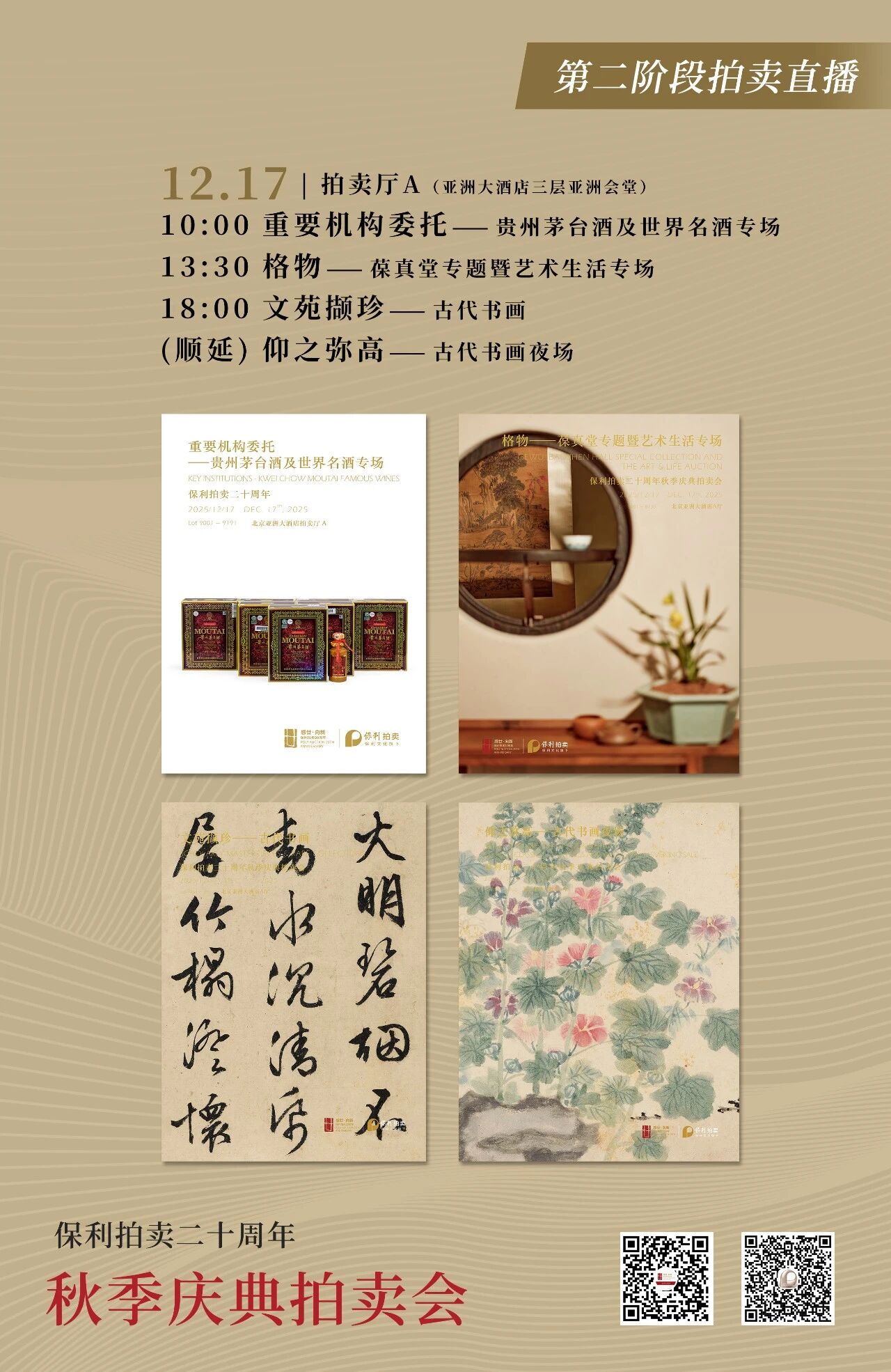 12月13日至15日,保利拍卖二十周年秋季庆典拍卖会第二阶段预展于北京新保利大厦隆重登场,中国书画、古代书画(含古籍文献)、陈年佳酿、世界名人字札,4大门类,逾千件艺术珍品,汇聚一堂,共同呈现一场融汇古今的艺术盛宴。诚邀各位藏家朋友莅临观展,期待与您共赴这场艺术之约,于珍品之间,觅得心动之选。