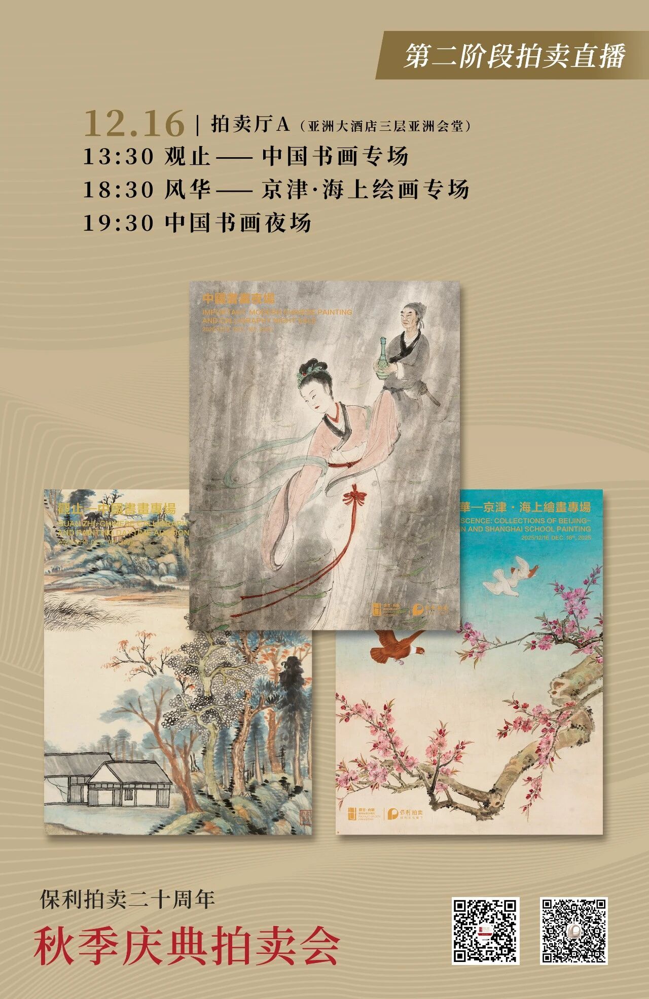12月16日至18日,第二阶段拍卖即将举槌,从丰富多彩的日场到扣人心弦的夜场,我们将全天候为您直播拍卖盛况。在拍卖期间,“北京保利拍卖”视频号将进行直播,敬请提前关注。