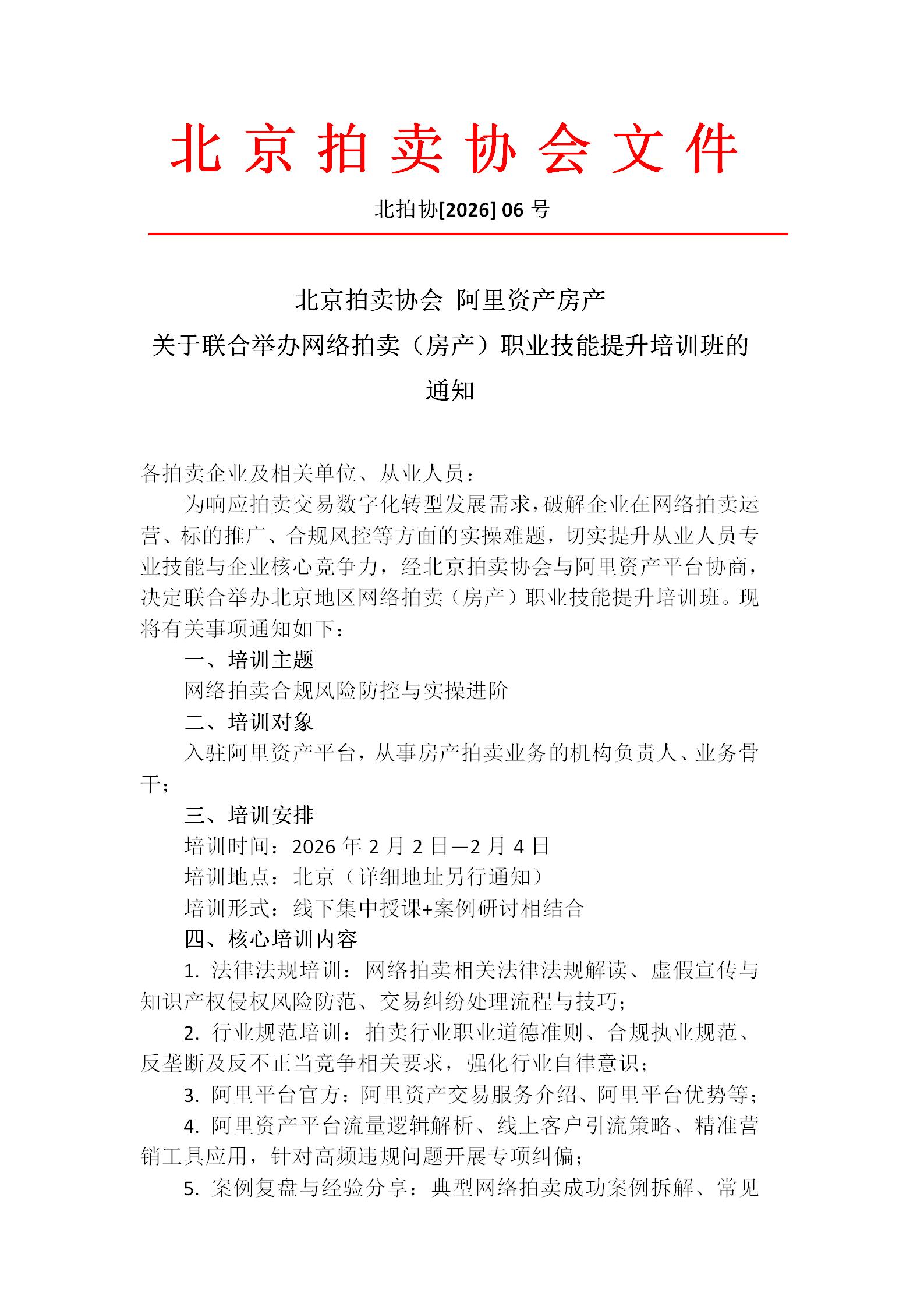 北京拍卖协会 阿里资产房产 关于联合举办网络拍卖(房产)职业技能提升培训班的通知