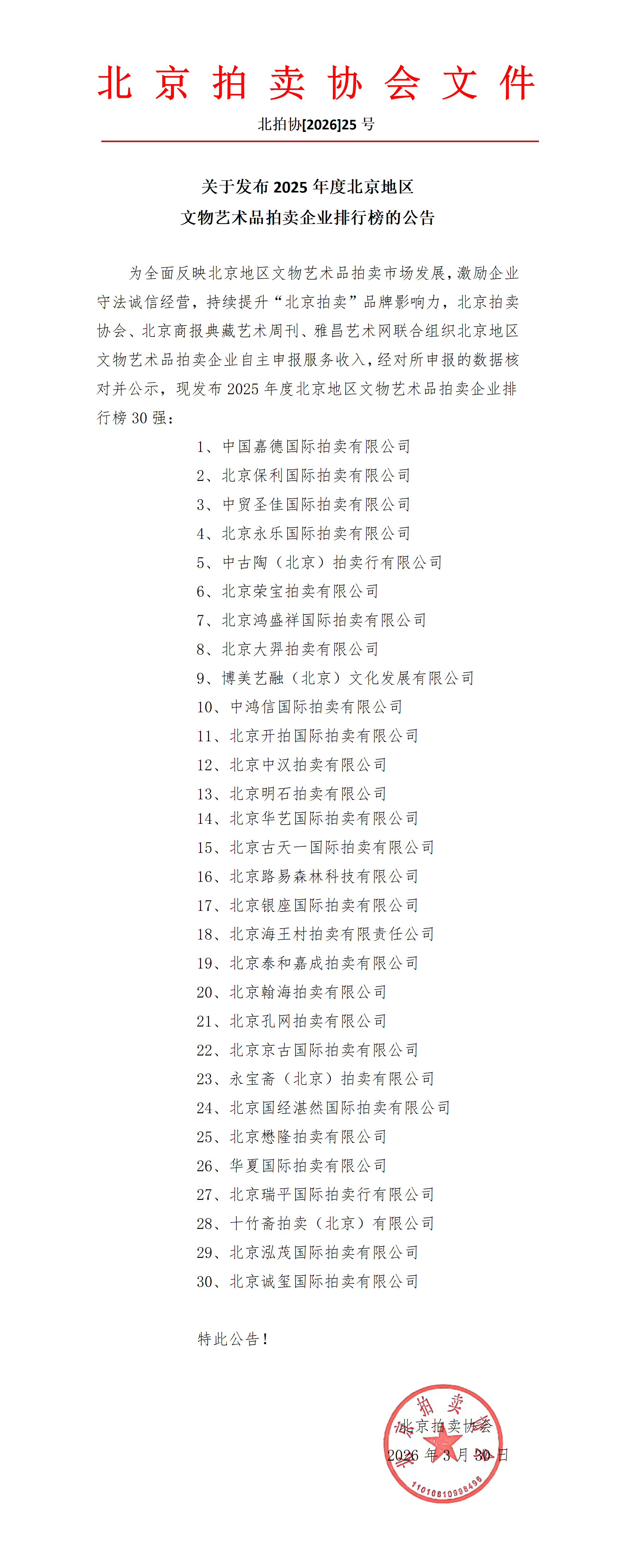 关于发布2025年度北京地区文物艺术品拍卖企业排行榜的公告
