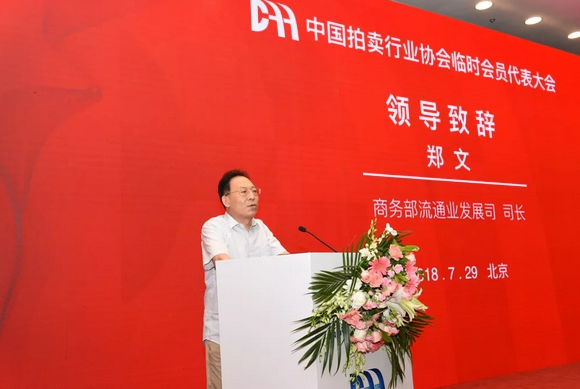商务部流通业发展司司长郑文在致辞中讲到,对中拍协会员代表大会的召开表示祝贺。首先充分肯定改革开放以来拍卖业取得的成绩。拍卖自1986年恢复以来,业务、成绩不断增加,截至2017年底拍卖企业已达7000家、成交额超7000亿元。第二,适应经济发展变化,促进行业转型创新。拍卖行业需要拥抱变化,拓展拍卖资源,提升服务水平。第三,希望中拍协更好地发挥桥梁纽带作用,为会员提供更好的服务。做好服务是协会的职责,协会只有服务好,才能赢得会员的支持。